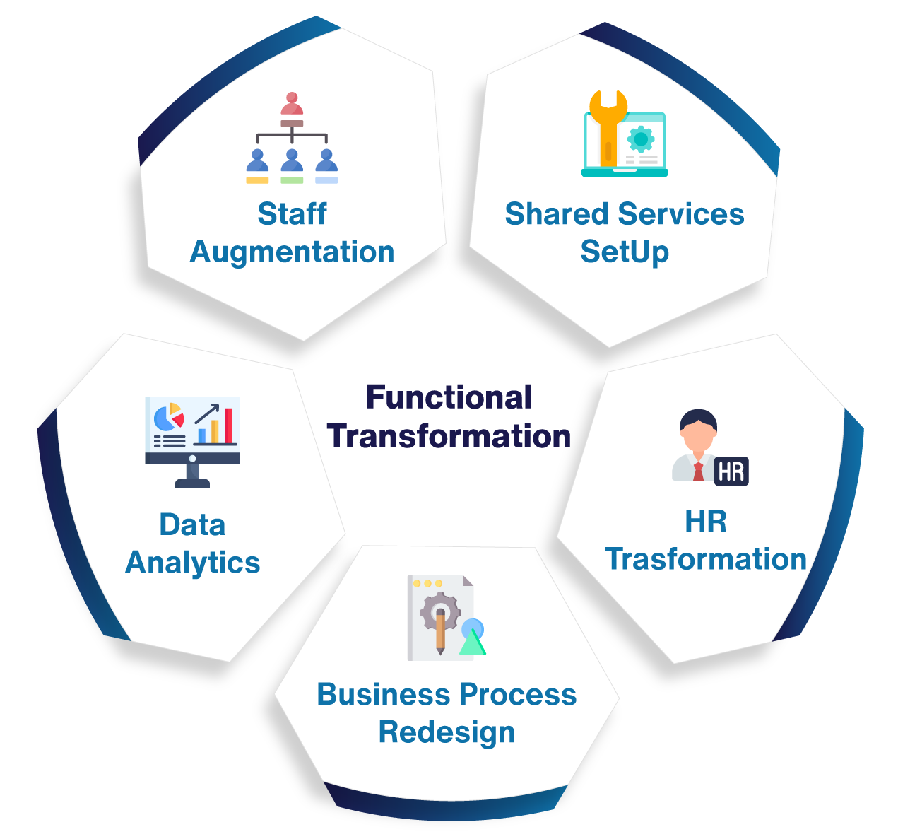 We ensure the seamless rollout of the developed solution, managing change comprehensively from start to finish. This revised version provides a clear and concise overview of your shared services offerings.